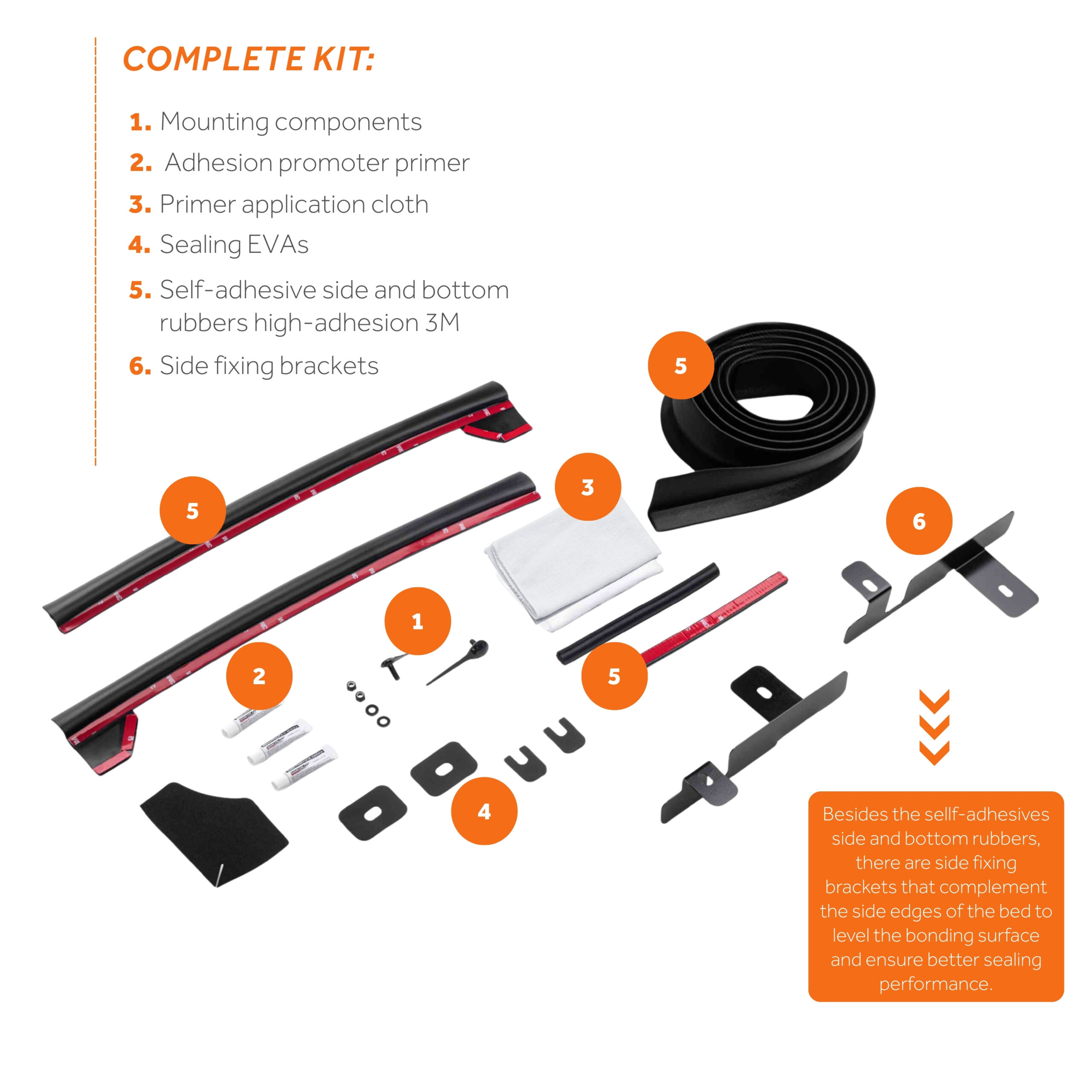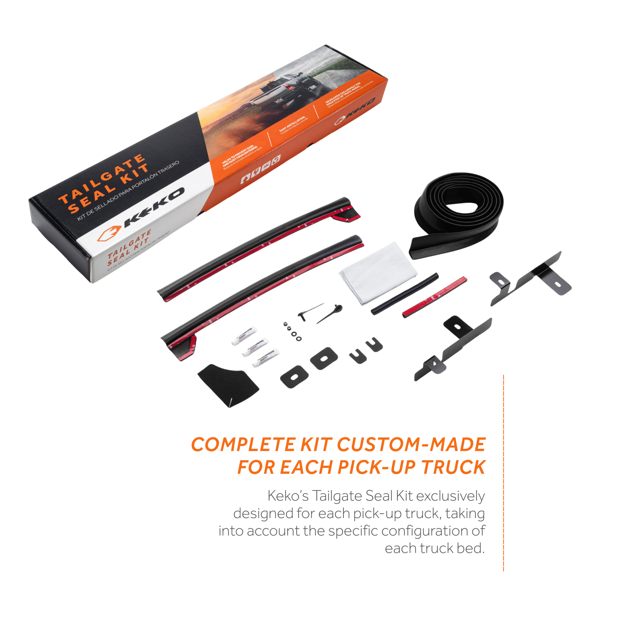 Developed exclusively for each pick-up truck model, no adaptations required. Does not interfere with the opening and closing of the tailgate. Made of high-performance rubber and bonding tapes. Compatible with Ford F-150 (year 2016 and above).